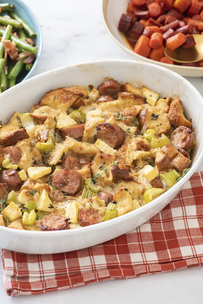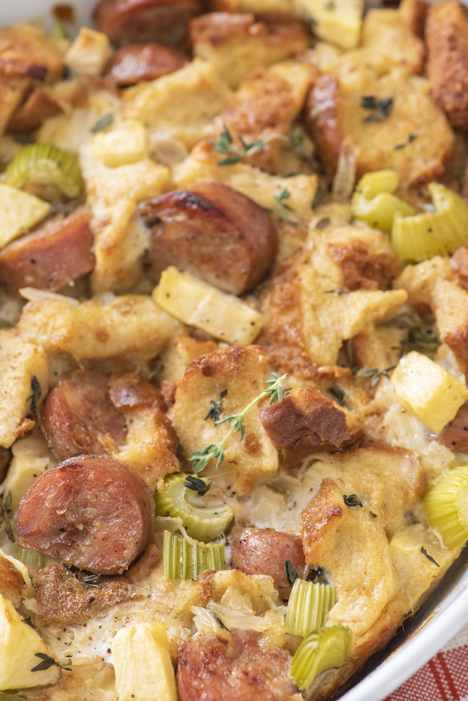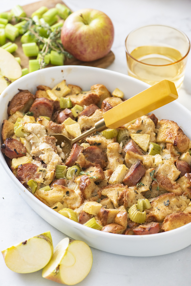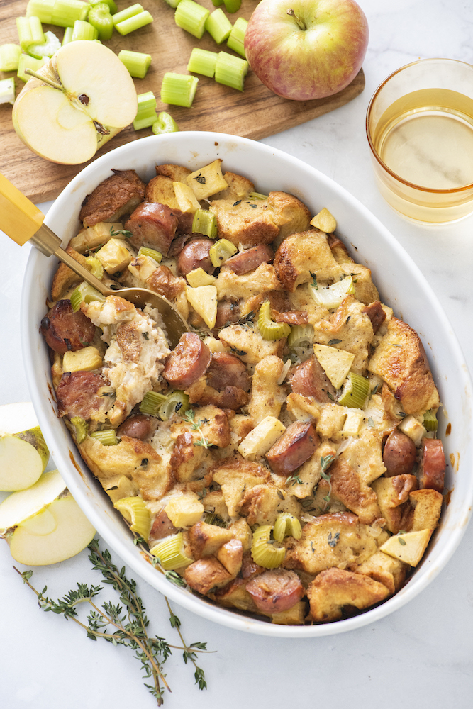 Stuffing is one of those Thanksgiving foods that I’ve found you don’t have to twist a kid’s arm to eat. I mean come on, the base of it is bread! With a crispy top layer and fluffy savory texture under the surface, this stuffing (or dressing) is pretty much your turkey’s best friend this Thanksgiving. This stuffing recipe in particular is my kids’ favorite one, hence why I named it Kid’s Apple Sausage Stuffing!