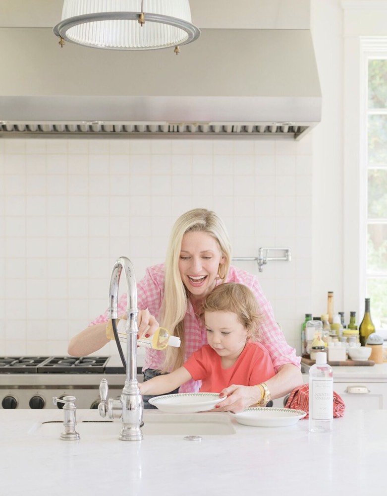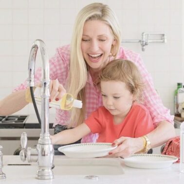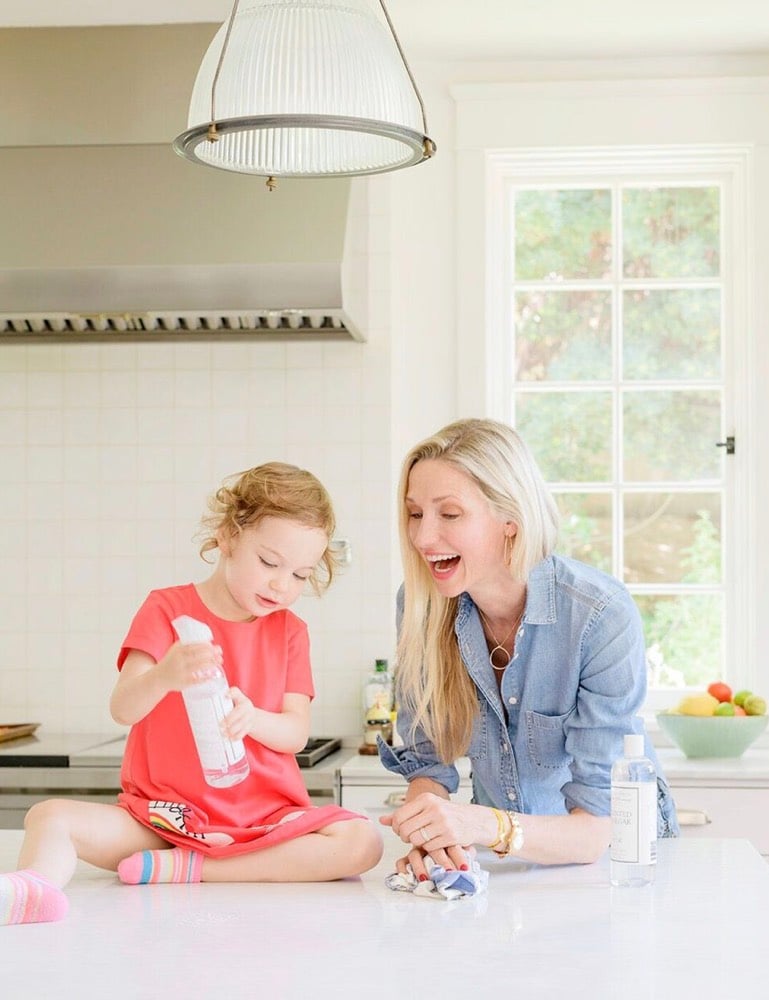 In my experience, no age is too young to get children involved with kitchen cleaning. In fact, I find in their earlier years (ages 2-4), motivating my children to help with the simple task of washing dishes was as easy as showing them the fun and playful bubbles that come alongside rinsing dishes into a sink full of suds. Though I would supervise and help with this process, I find it’s important to ensure the children understand they share the responsibility of completing the task, which is something they can be proud of when it’s all finished. When it’s time to gather the kids to help mom wash dishes, I like to use low-sudsing Dish Detergent from The Laundress along with their Kitchen Soap Bar. Both are nontoxic and allergen-free so I always feel comfortable letting the kids take the reins by rinsing dishes, pots, and pans on their own before helping me load them into the dishwasher. When the dishwasher cycle is finished, I like to have Gemma carefully pass me each dish and watch as I place them back in the cupboards so she can see the pattern of returning the same dishes to their respective cabinets. As an added bonus, I let her help me push the dishwasher closed – it’s super cute.