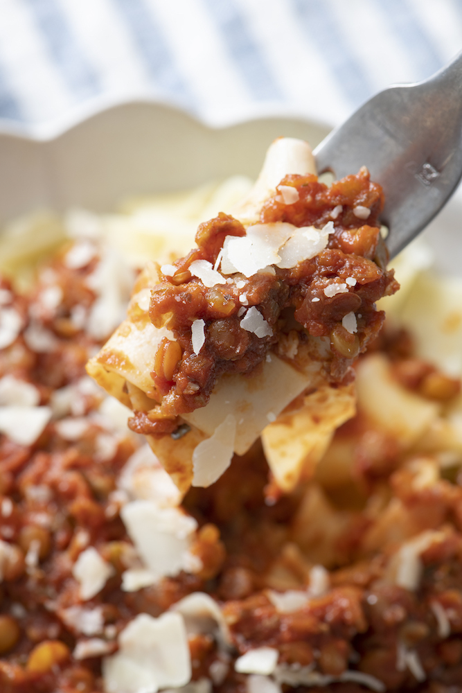 There’s nothing better than a big heaping spoonful of bolognese over fresh pasta. It’s and ultimate comfort food! Just because you’re vegetarian doesn’t mean you shouldn’t get to enjoy the wonders of bolognese. In this recipe, lentils and mushrooms replace the typical meat you find in a classic bolognese so you’re getting tons of protein. And I promise, when I tried out this vegetarian take for the first time I didn’t even miss the meat! Looking for more uses for lentils? Try Baked Farro with Lentils, Tomato and Mozzarella, Lentil Chickpea Burgers with Avocado Yogurt Sauce and Crock Pot Lentil Veggie Stew.
