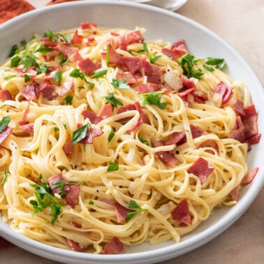 Step 5: Add cooked pasta to the egg mixture and stir immediately (so the eggs don’t curdle). Add the sautéed bacon and onions and 1/2 cup of the reserved pasta water*. Toss to combine and serve immediately. (*see cook’s note in recipe card below).