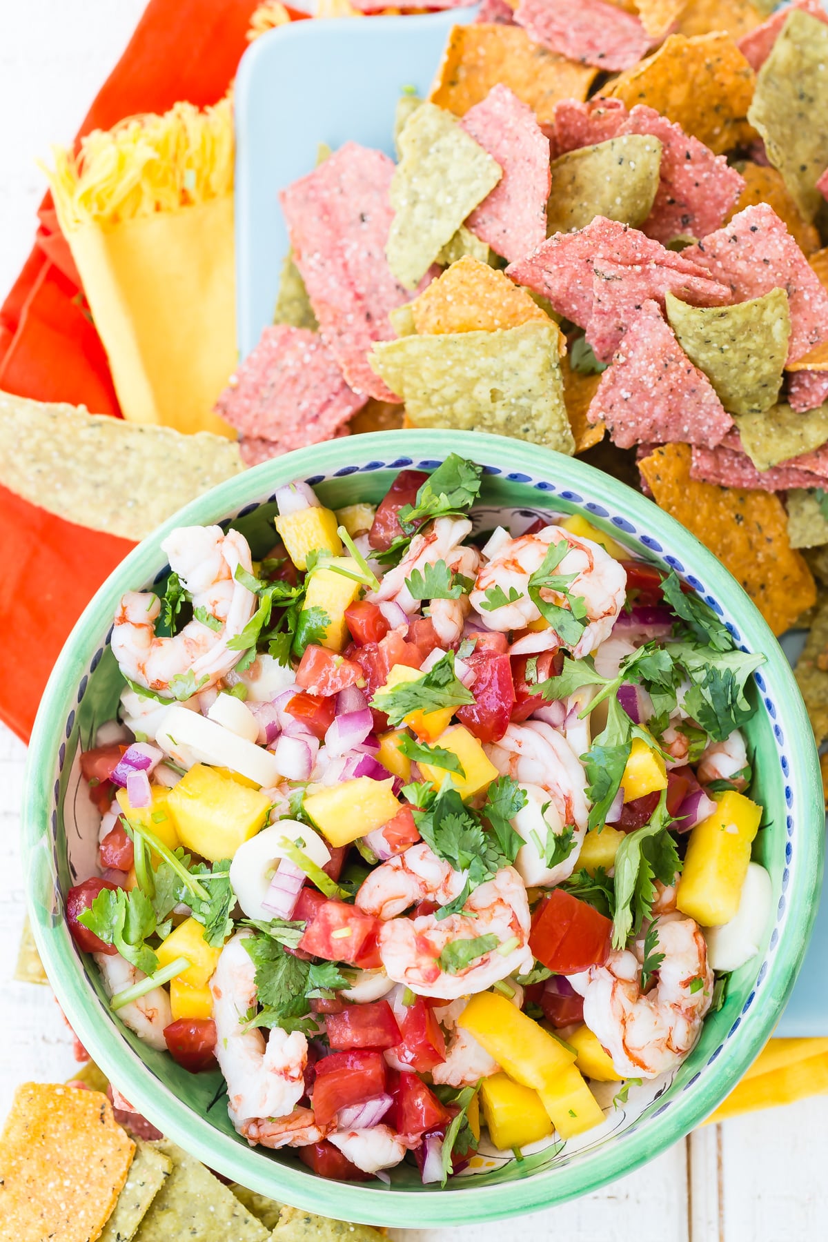 From the first time I got the travel “bug” I fell in love with the idea of traveling to South America. My love of food has always been related to the countries I want to visit so enjoying ceviche in Peru and Chile was at the top of my list. I remember the first time I had ceviche and thinking it was incredibly exotic. Just the idea that seafood could be “cooked” in lime juice had me intrigued. This Mango Shrimp Ceviche is the perfect first step into a world of light, bright flavors that will have you and your kids begging for more.