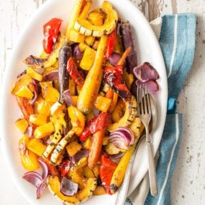 These Maple Roast Vegetables are a holiday favorite in our house but also the perfect side dish any night of the week. Roasted to perfection then lightly sweetened with maple syrup, they’re an irresistible recipe the whole family will love.