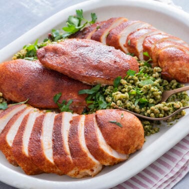 Oven: Bake at 350°F for 25–30 minutes or until a meat thermometer reads 165°F. I love baking chicken because it basically cooks itself while you’re busy doing other things. In a pinch, you can bake chicken straight from frozen, just add about 50% more cooking time and make sure the internal temperature reaches 165°F.