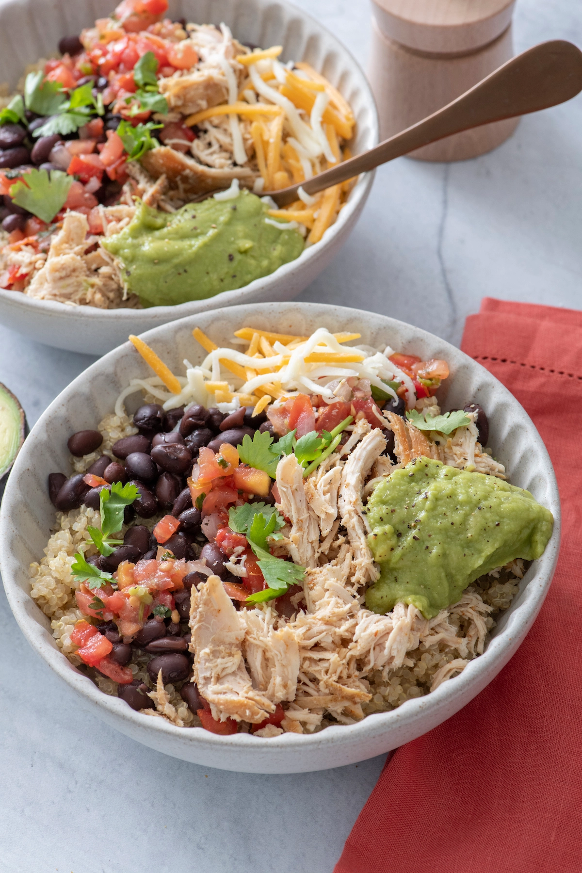 Thursday: Slow Cooker Chicken Burrito Bowls with Perfect Brown Rice, Pressure Cooker Black Beans, Guacamole and salsa for toppings!