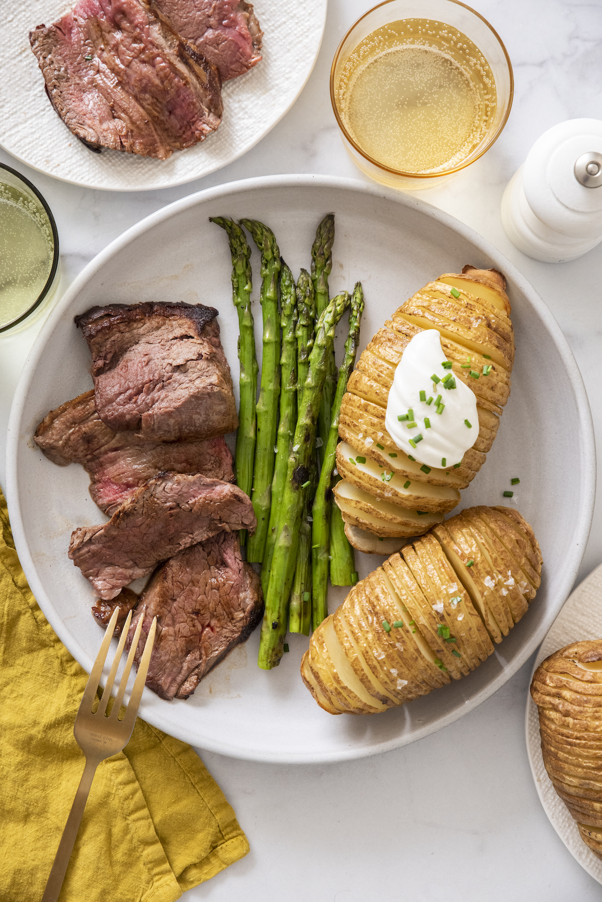 Tuesday:ย Tender and juicy Pan Seared Beef Tenderloin with Yukon Gold Potato Fans and Grilled Lemon Asparagus. Steak is Chloeโs all time favorite food so she is PUMPED for this meal!
