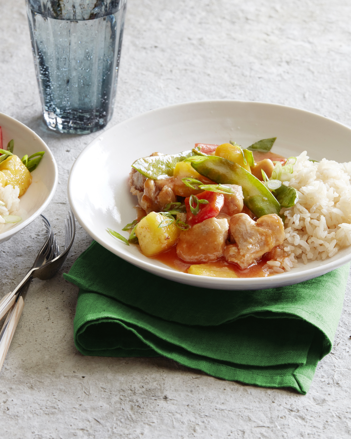 Wednesday:ย Sweet and Sour Pineapple Chickenย with Un-fried Rice. Chunks of sweet, juicy pineapple, bell pepper, crisp sugar snap peas and juicy chicken all in one dish? Yes please!