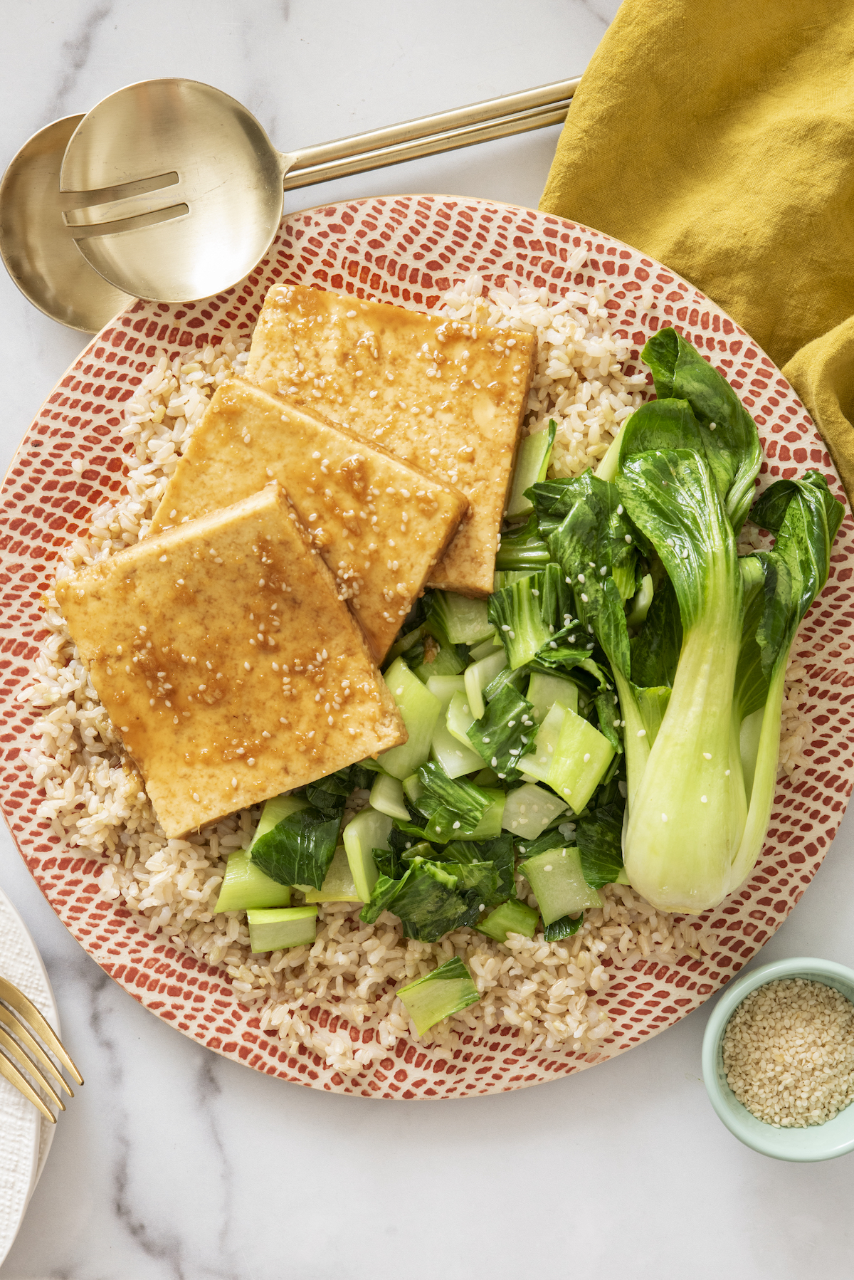 Tuesday:ย Sweet Gingery Tofu with Sauteed Baby Bok Choy served over rice! We canโt get enough of this tofu recipe.