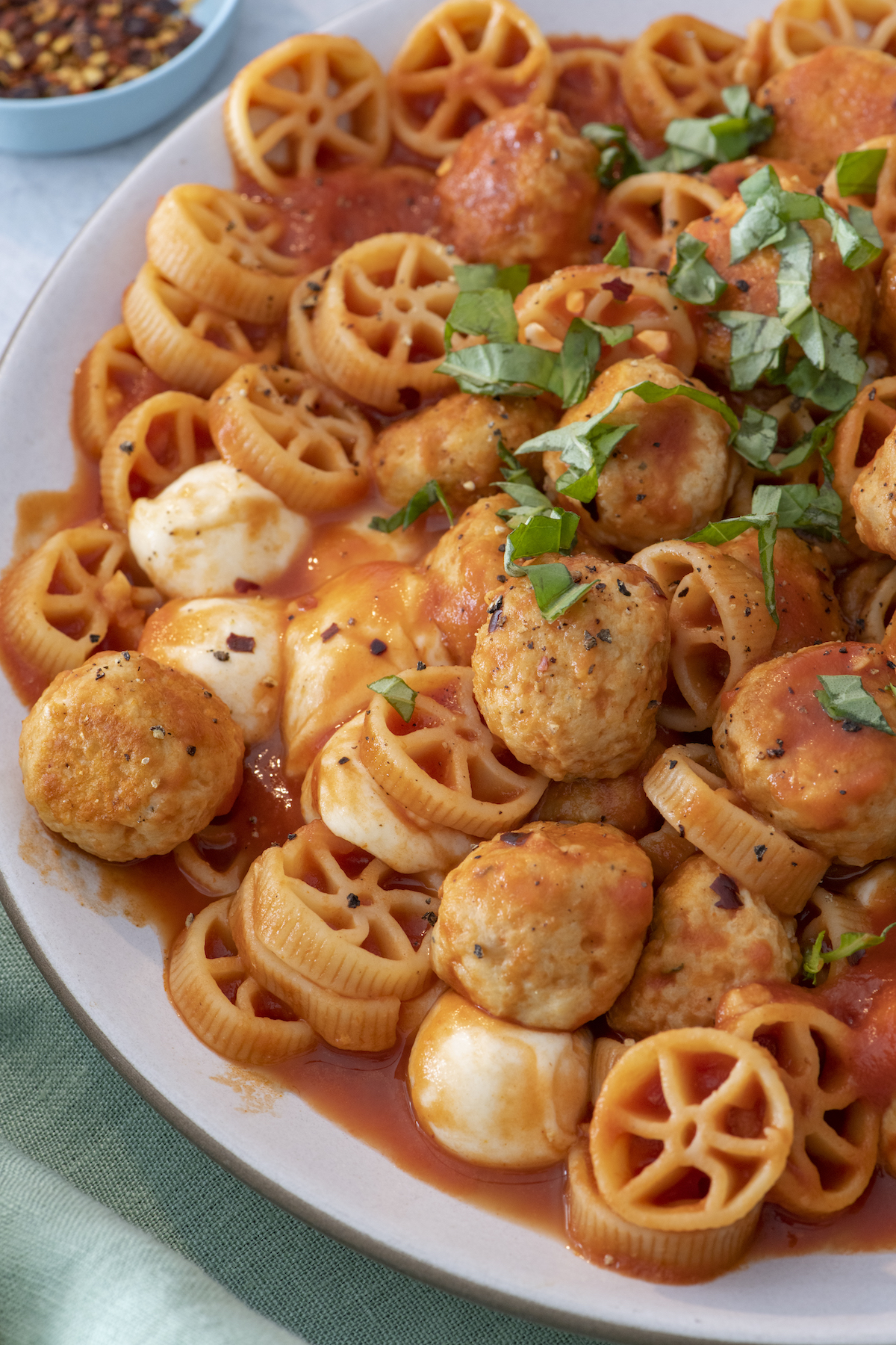 Wednesday:ย Chicken Meatballs with Mini Wheel Pasta and Crispy Broccoli. This is one of our favorite pastas to make!