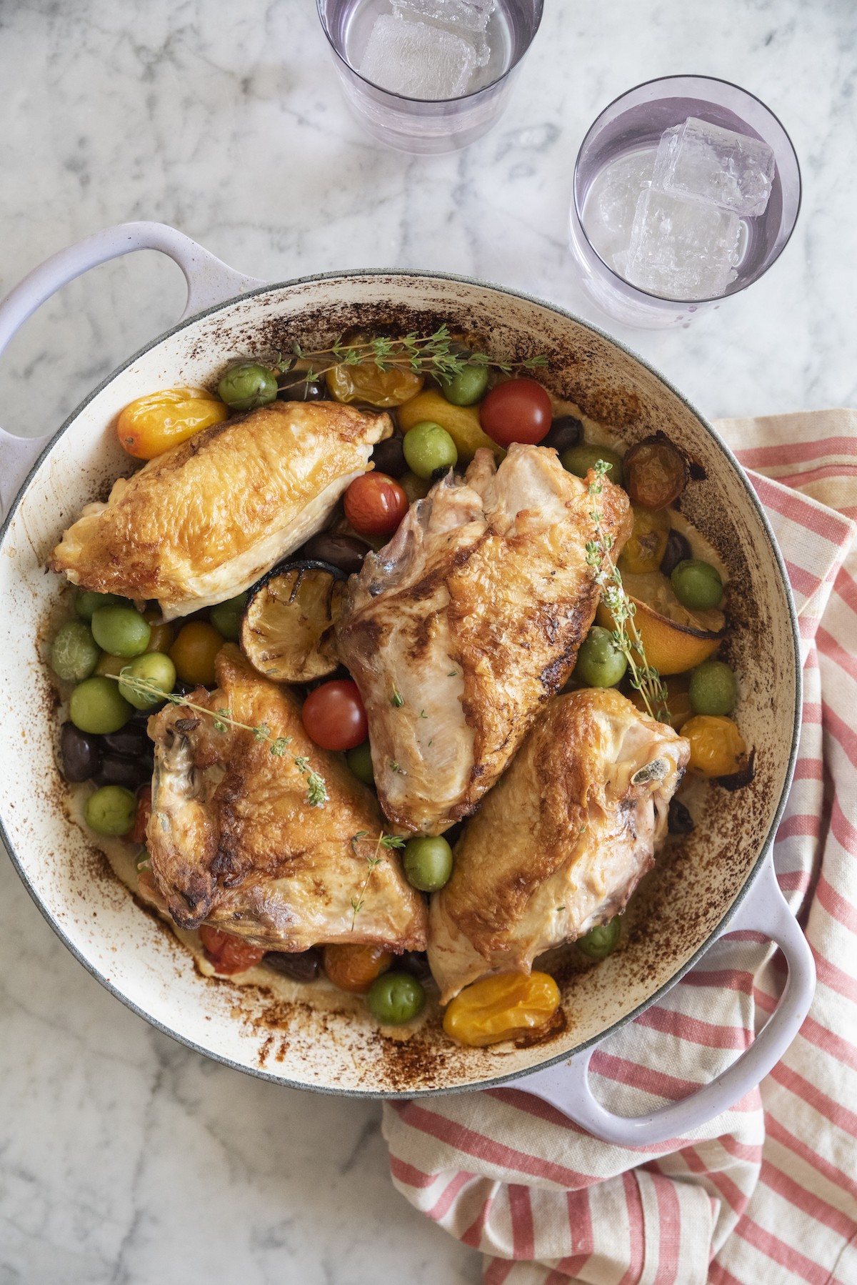 Sunday: Roast Chicken with Caramelized Lemons, Cherry Tomatoes and Olives with Twice Baked Potatoes and Steamed Okra for Sunday supper.