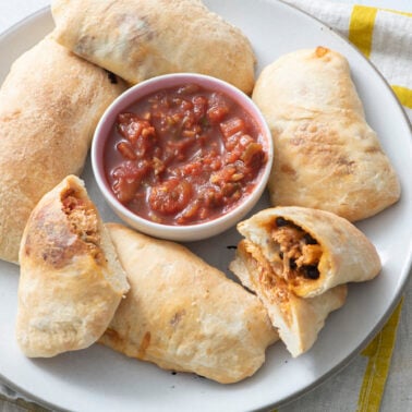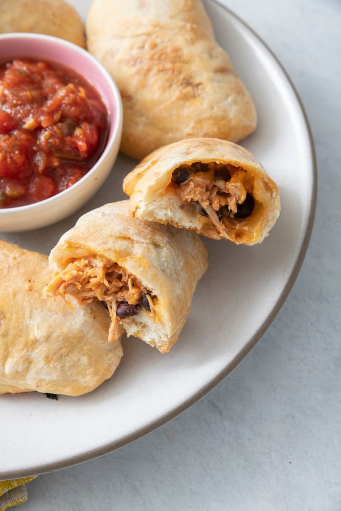 With that said, they were still one of my favorites as a kid. I’m always out to create recipes for my kids that remind me of growing up so I wanted to take a go at pizza pockets but with a twist. My kids love Mexican food and pizza, so these Mexican Pizza Pockets are a super fun way to combine both! They’re filled with shredded chicken, beans, salsa and tons of cheese and then wrapped in pizza dough. My kids LOVED them!