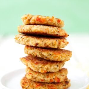 - Once all the patties are made and resting on a plate, heat 1 tbsp or oil in a saute pan over medium heat and saute the patties for 5 minutes on each side or until golden. Repeat with remaining patties and add remainder oil if needed.