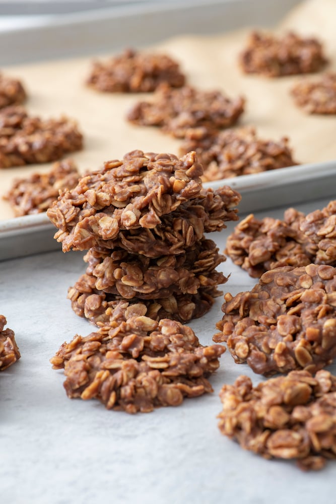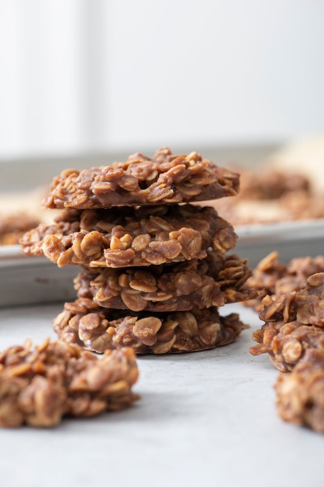 I also make them every year now and everyone absolutely loves them. They’re one of my family’s traditions now too. Missouri Cookies are really easy to make, perfect for the kids to help you with, and a stove top recipe — no oven required. And did I mention that they are INSANELY delicious? The perfect combination of chocolate (made from scratch!), peanut butter and oats wrapped into one tasty, chewy cookie.