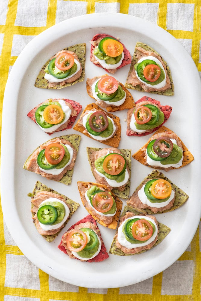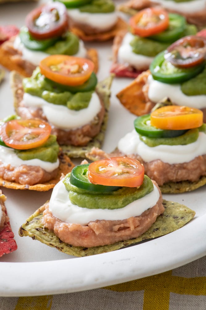 For these Nacho Scoopers I like to take really big and sturdy nacho chips and layer them with healthy refried beans, guacamole, sour cream, jalapeños that have been seeded (an important step if you’re serving them to little kids) and a sweet cherry tomato on top. You can totally make them your own by adding other ingredients like olives, grated cheese, chopped sautéed peppers or even cooked sausage.