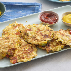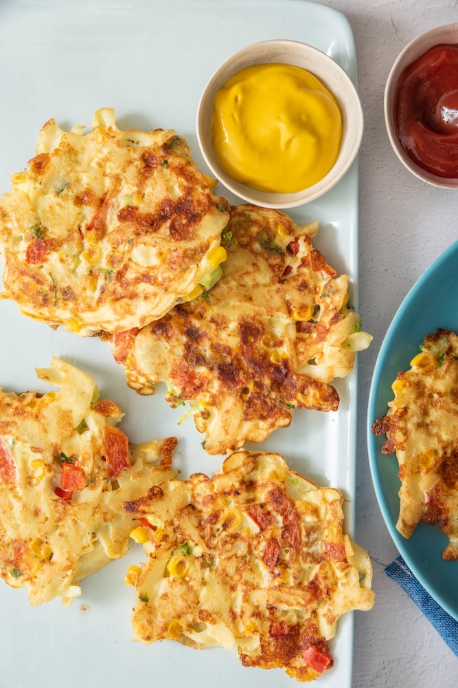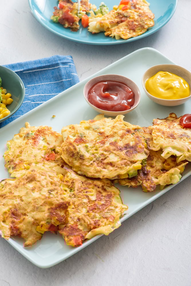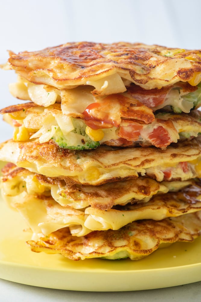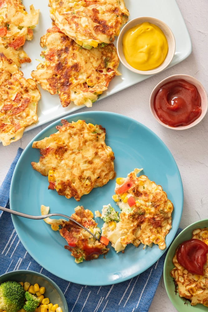 Noodles on their own can be difficult for some little ones to eat, but these pancakes are perfect for little hands to hold on to and munch away. If you have picky eaters, serving with a side of ketchup or mustard for dipping can help entice kids to try something new!