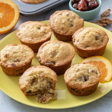 This is the perfect muffin to make at this time of year since dates and oranges are both in season. I even bought the walnuts for this recipe at the farmer’s market and they were so fresh, added a nice crunch and dash of protein to the muffins making them the perfect snack. Like I said, muffins are our favorite so we have several in rotation right now like Flourless Pumpkin Chocolate Muffins, Zucchini Muffins, and Apple Pie Muffins to name a few.