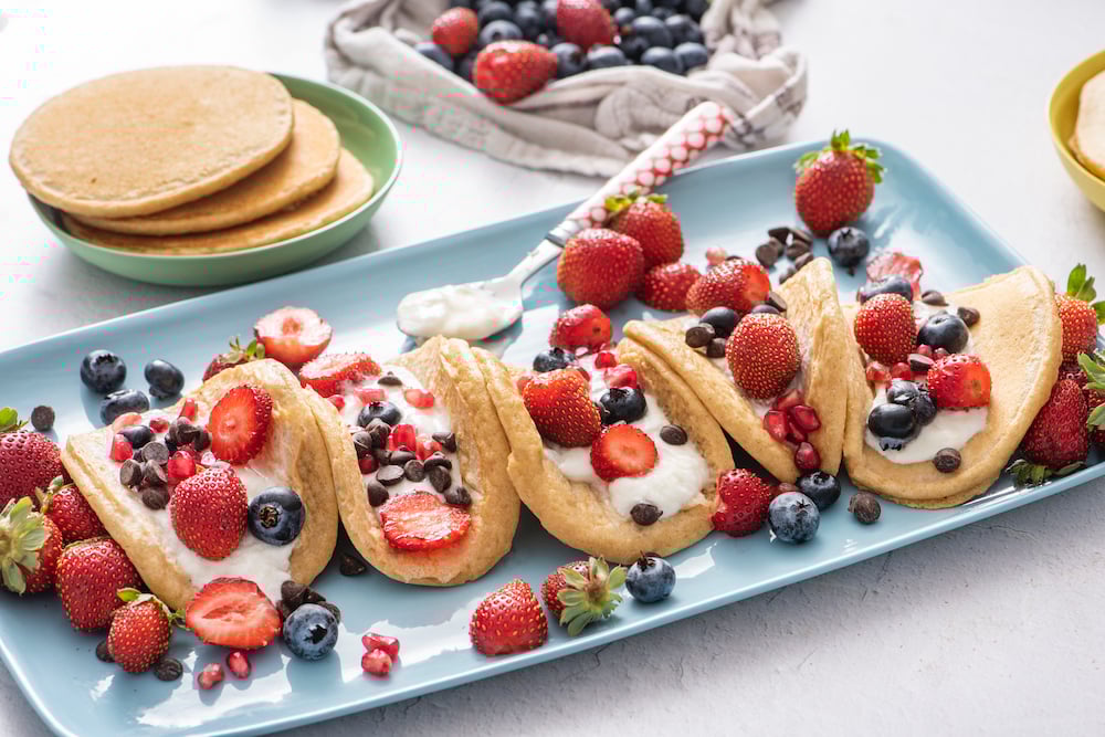 I love it when they get extra creative with their food creating new ways to eat what seems like a straightforward food. Kenya hadn’t been feeling great a few weeks ago and was sticking to the BRAT diet – bananas, rice, applesauce and toast. On this occasion, Kenya sat at the table after a day without eating from being sick. He sat staring blankly ahead with little interest in the leftover whole wheat pancakes I had placed in front of him. The next time I turned around he had filled the pancakes with yogurt and fruit calling them “Pancake Tacos”. He looked just like he was at a Mexican restaurant, tilting his head slightly to the side making sure that not a drop of the creamy filling dripped out of his “taco”.