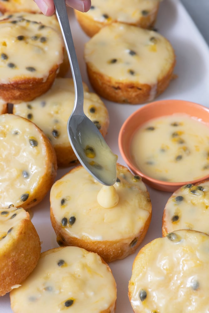 - For the glaze, combine passionfruit juice and seeds with powdered sugar. To thin out the glaze, add a tablespoon at a time of water or milk.