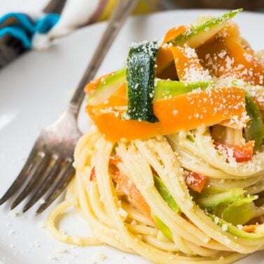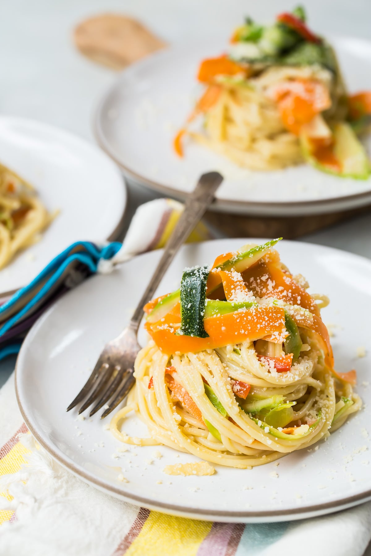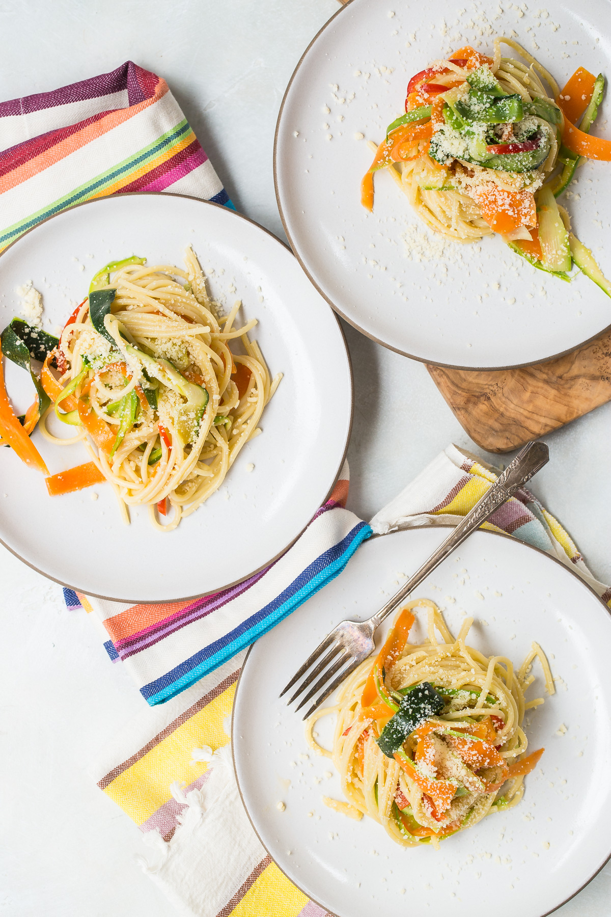 Me and the kids had so much fun at the farmer’s market buying all the veggies that go into Pasta Primavera, but you should feel free to use any vegetables you have on hand. The possibilities are endless. You could even try peas, broccoli or anything that’s fresh and in season. The julienned vegetables are so beautiful and thin, even kids who normally turn their noses up at them will only see the gorgeous colors in each bite and have a hard time resisting it.