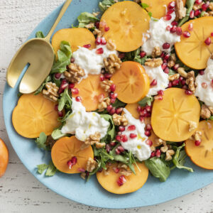 Whenever I’m hosting friends for a party, serving dinner during the holidays or need to bring a dish to an event, salad is my go to. There can be 10 different dishes on a buffet table and without fail the salad disappears first. In the fall I tend to lean towards making Easy Breezy Roast Veggie Salad or Winter Farmers Market Salad, but this Persimmon Burrata Salad is so kid and adult friendly that I’m making it for 3 parties over the holiday weeks. It only takes minutes to create and the vibrant colors, textures and flavors make it a true standout. I’ve seen my kids sit over it and pick out their favorite bites one after one until it disappears.