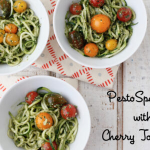 The Inspiralized cookbook shows you how to turn everyday vegetables into healthy, creative, satisfying meals that are not only creative, but as I’ve been finding from the recipes I’ve tried in the book, also delicious. The night I made this Pesto Spaghetti with Cherry Tomatoes for six people every last bite was consumed. It’s true that everyone in our family loves pesto, but this simple recipe really showcases all of the ingredients in the best way possible. The best part is that it’s gluten-free, so you can serve this “spaghetti” to your favorite pasta lovers!
