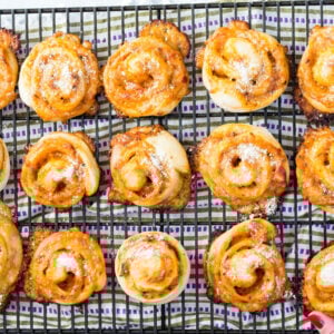 - Place pinwheels on a parchment or silpat lined baking sheet and lightly press them with the palm of your hand to slightly flatten and bake for 12-15 minutes.
