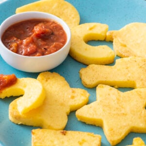Making Polenta Cutouts is a fun way to get to use those cookie cutters in your drawers that don’t get enough love. Creating fun shapes using the polenta is a great way to introduce your kids to a new food they might not have tried before!