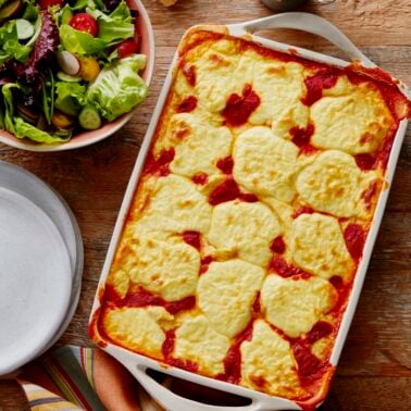 Have friends who try to stick to a gluten free diet? This is the recipe for them! Polenta is naturally gluten-free, but also a tasty canvas for layers of luscious red sauce (buy your favorite jar from the market or make homemade if you have time), ricotta cheese and irresistible mozzarella cheese that turns into perfection in every bite.