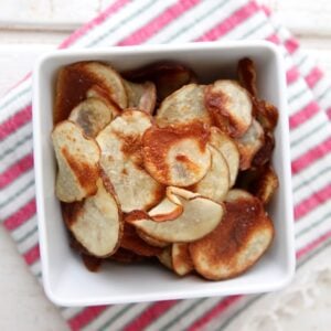 OK, seriously, who doesn’t like a potato chip? Left to my own devices I could devour an entire bagful in one sitting. However, your average store-bought bag of chips is laden with saturated fat and calories that I don’t want or need, and while I don’t want to deprive Kenya of the great treat of chips, I certainly want to keep him away from bad fats and mega-doses of sodium. Sure, most chip makers offer “healthy” versions, but they’re still not great for you and why spend the extra money when you can make even better ones on your own for a huge fraction of the price?