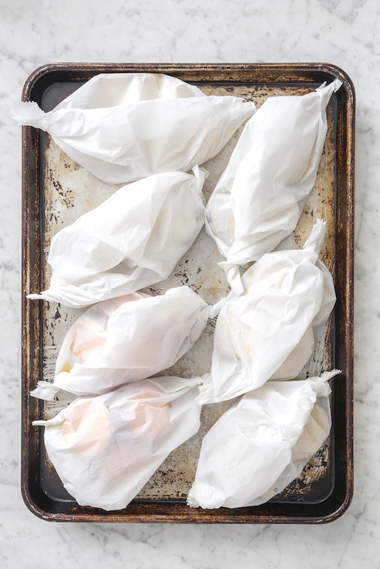 - Place a 24 inch sheet of parchment (or foil) on a cookie sheet and fold in half (this could also be done in smaller individual packets using smaller pieces of parchment or foil)