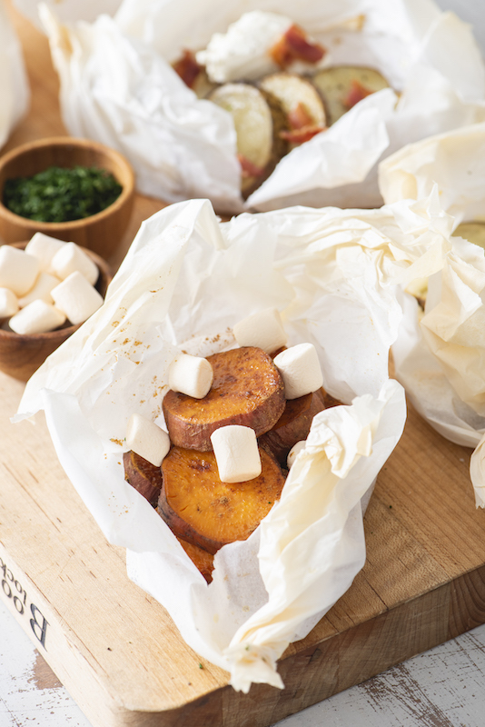 You might think that a pat of butter is all you need to finish them off, but baking these Potato Packets is only the beginning of the fun. I put out a ton of toppings for the kids to make their own special potato creations. Cinnamon, marshmallows and brown sugar are great for sweet potatoes, while broccoli, cheddar cheese, crispy bacon, sour cream and more go perfect with russet potatoes. You want to allow the potatoes to be just the beginning of this interactive side dish and get ready to jazz them up with all of your toppings!