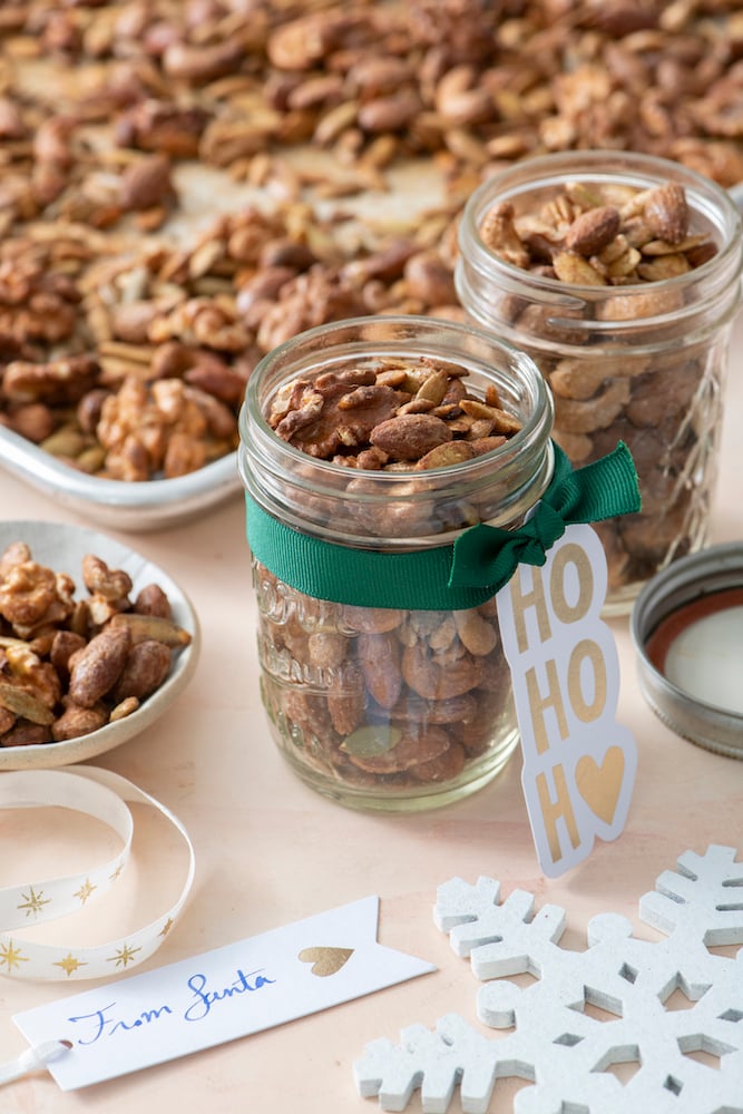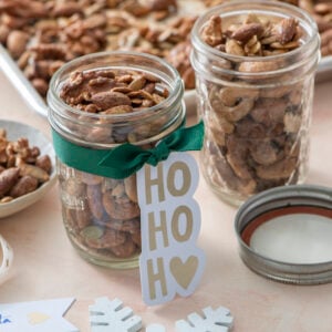 The best part is that these Pumpkin Spice Mixed Nuts and Seeds only take minutes to whip up making them a fantastic gift for someone special during the holidays. You can also prepare them ahead of time so you can have a few jars to bring to holiday parties when you need something quick. Just add a tag and bow to the top and you’ve got an addictive festive treat!