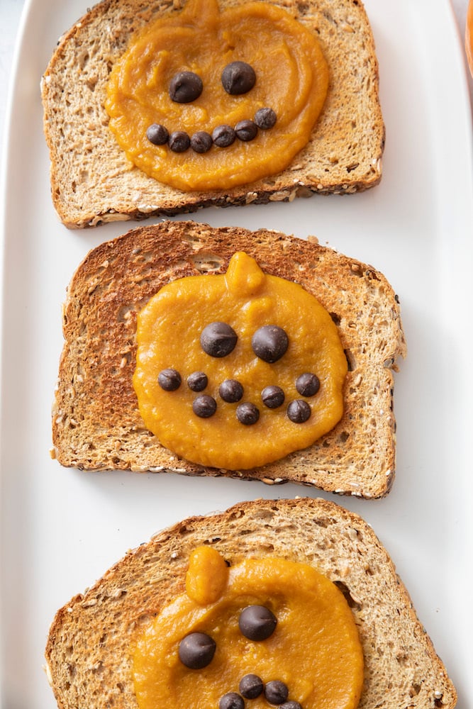 The simplest Halloween breakfast or snack is Pumpkin Toast! They’re only three ingredients, healthy for you and not to mention super duper cute.