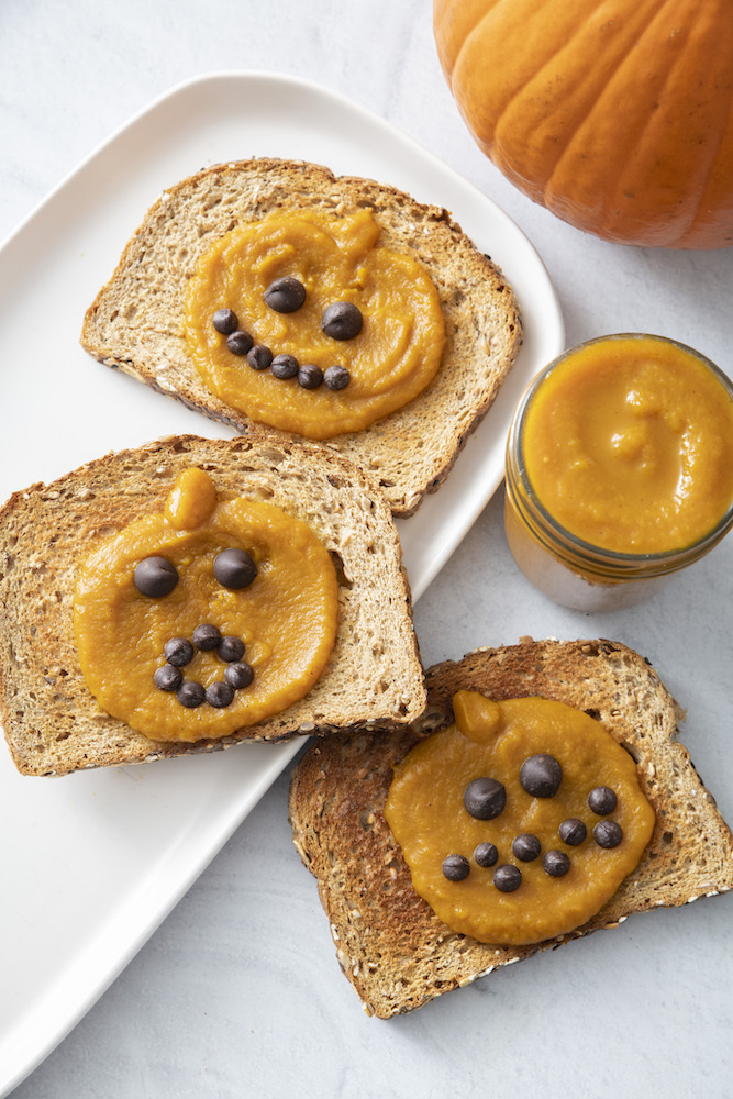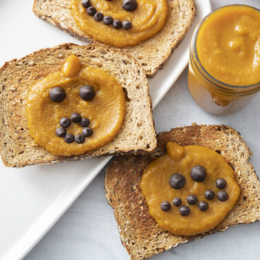 With Halloween right around the corner, I’ve been experimenting with a bunch of new pumpkin recipes. Pumpkin butter is one of my fall favorites, so one morning after making my first batch of the season, I took a heaping spoonful and dolloped it on top of a warm slice of just-out-of-the-toaster crusty deliciousness. With the back of the spoon I quickly fashioned the pumpkin butter into a pumpkin shape, which was enough to get my kids excited. Don’t judge me too harshly for then grabbing a bag of chocolate chips at 7:30am to make the Jack O’Lantern face. I couldn’t help myself. You can easily substitute raisins for the chocolate, but what’s Halloween without some sweets?
