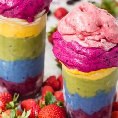 - Pour the purple nice cream into the bottom of two tall glasses, and place in the freezer while you make the next layer. Freezing between layers will ensure the colors don’t bleed or blend together. Repeat with each remaining color.