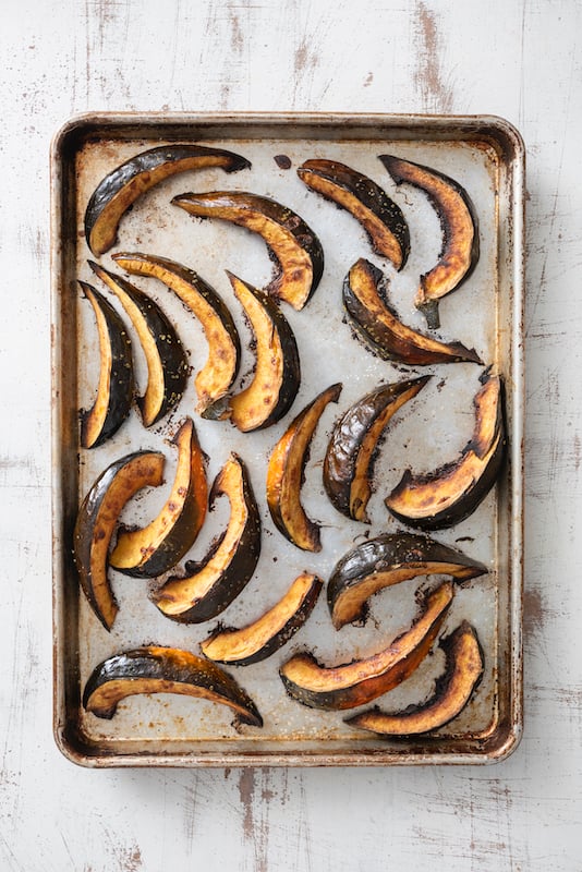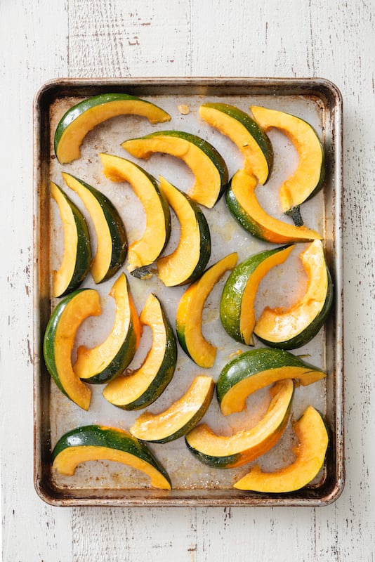 - Place the squash wedges on a baking sheet, drizzle with olive oil and sprinkle with salt.