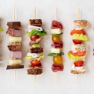You likely have all of these ingredients in your fridge and pantry already. Keep on scrolling to see photos and descriptions of each variation of sandwich kabobs. You can send these to school as is, send a little mustard or mayo for dipping, or even drizzle with a balsamic glaze.ย