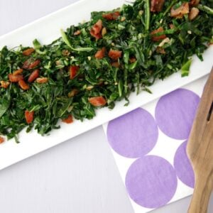 Green Ice Pops, Green Apple Juice and Spinach Cake Muffins are among Kenya and Chloe’s green-rich afternoon snack favorites, and Green Machine Pizza and Green Mac and Cheese are also mealtime go-to’s. However, on a night when I’m serving something like salmon or chicken, I like to get my greens in with these Sautéed Collard Greens. With the help of my friend and gardening guru Lauri, we started growing nutrient packed collard greens in our garden years ago, and since they grow like weeds, we always have plenty of them on hand for recipes like this one. Sautéed with a smokey piece of bacon and a few cloves of garlic, the collards remain emerald green after cooking and are truly irresistible.