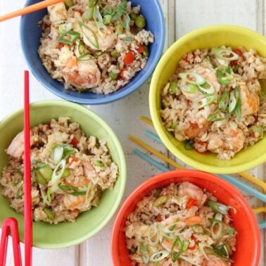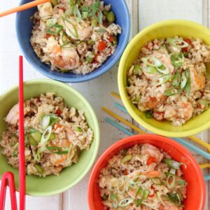 Instead of making really greasy Fried Rice I love making this Shrimp Un-Fried Rice for dinner. It’s a great use of leftover brown rice with tons of flavor and most importantly a quick weeknight family recipe to prepare!