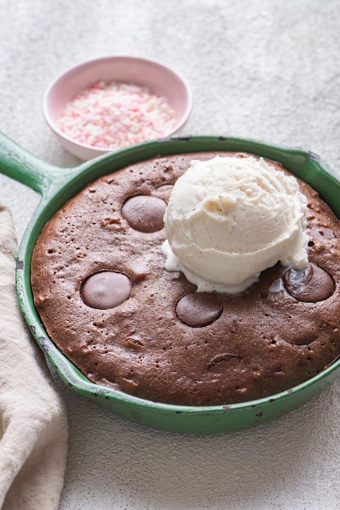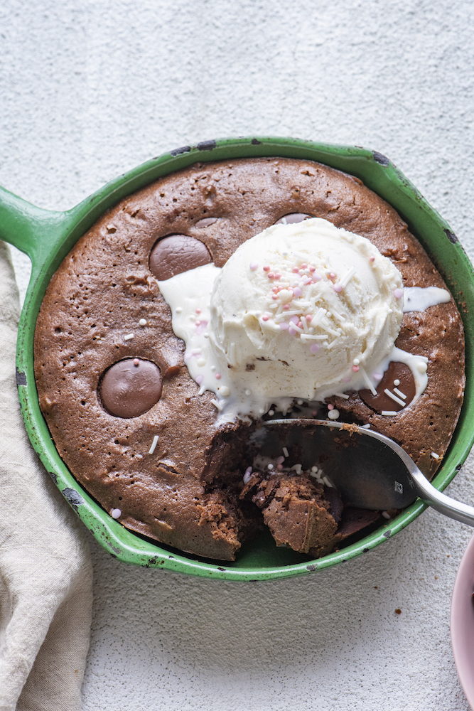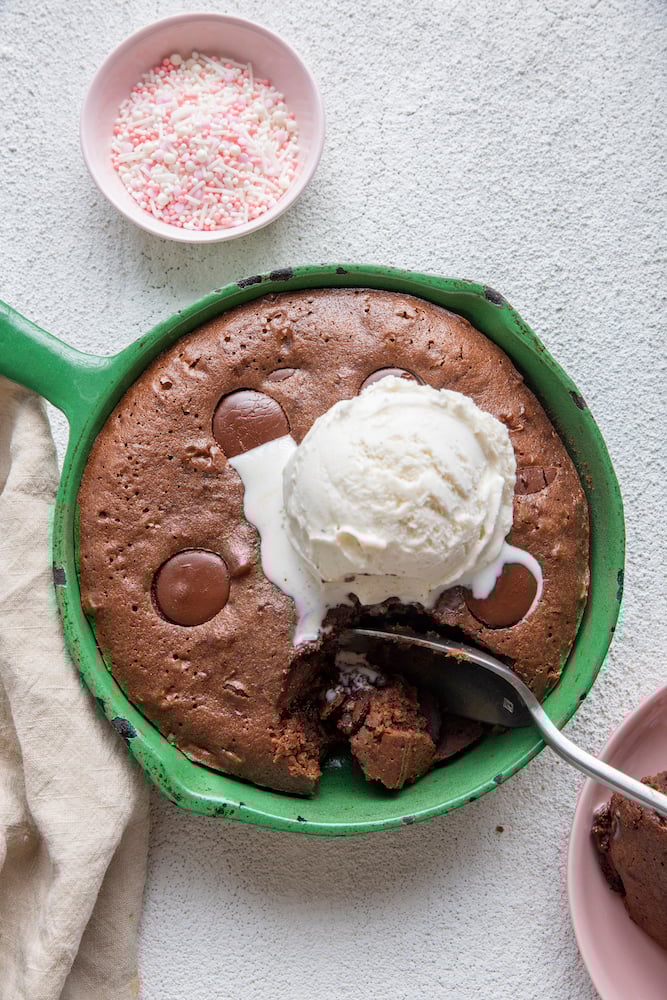 This Skillet Mexican Brownie is like a chocolate explosion in your mouth! The cocoa powder and the chocolate chunks in the batter pack a powerful punch for any chocolate lover out there. The secret ingredient that makes these brownies so top notch is a touch of cinnamon that adds a subtle pop of flavor. They’re best served fresh with a scoop of ice cream on top, but can also be frozen after they cool to have an indulgent treat ready to go when you’re in the mood!