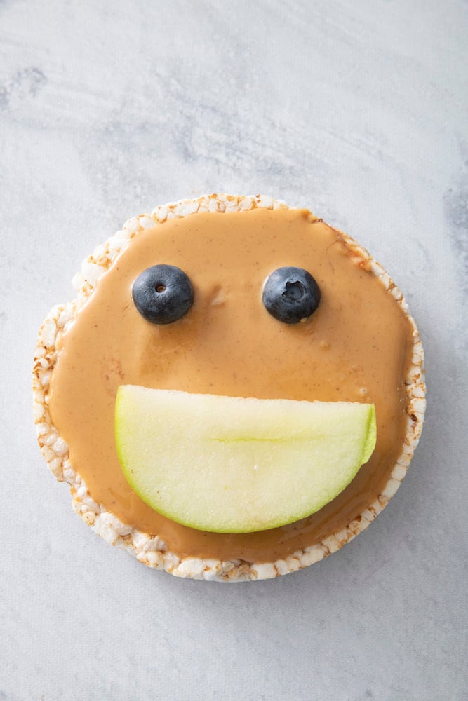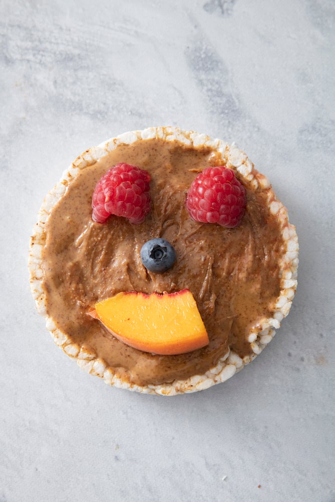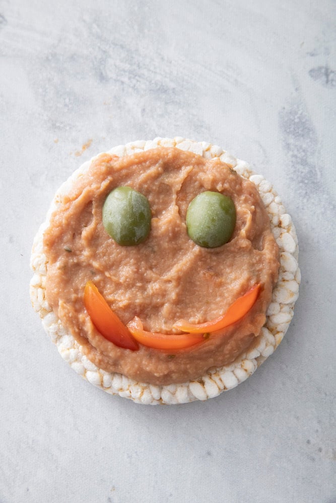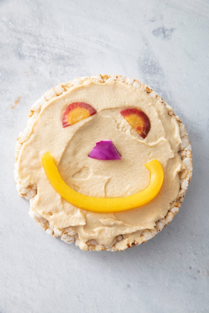 You can spread anything on a rice cake and get strategic with the toppings to make a face. Have your kids help you and see their faces light up! We spread these with with sunflower seed butter, refried beans, peanut butter and hummus and then chose different eye and mouth shaped fruits and veggies to make the smile! There’s no wrong way. Get creative and most of all have fun!