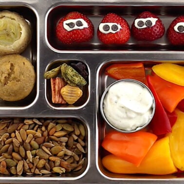 Most days if I ask Kenya what he wants for lunch he says โSNACK FOODSโ! Kids love food they can quickly grab and munch on, so you gotta get plenty of bang for your buck in every last bite!ย Strawberry Ninjas you can pop in your mouth, toasted pepitas + sunflower seeds that are crunchy and packed with protein, Upside Down Banana Muffins that have a special surprise underneath, sweet peppers that are fun to plunge into a zippy yogurt sauce and rice crackers my kids want to munch on all day! Whatโs your favorite lunch time snack food?ย