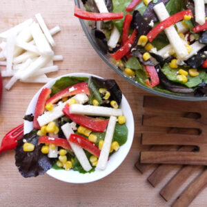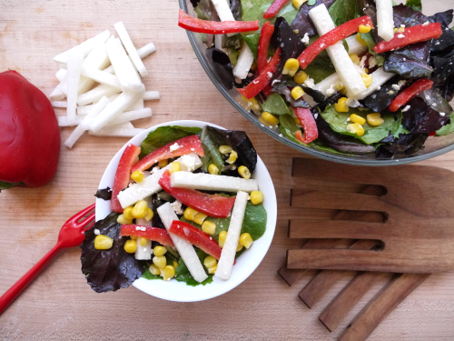 - In a large bowl, combine the salad greens, jicama, red bell pepper, corn, and cotija and toss to combine.
