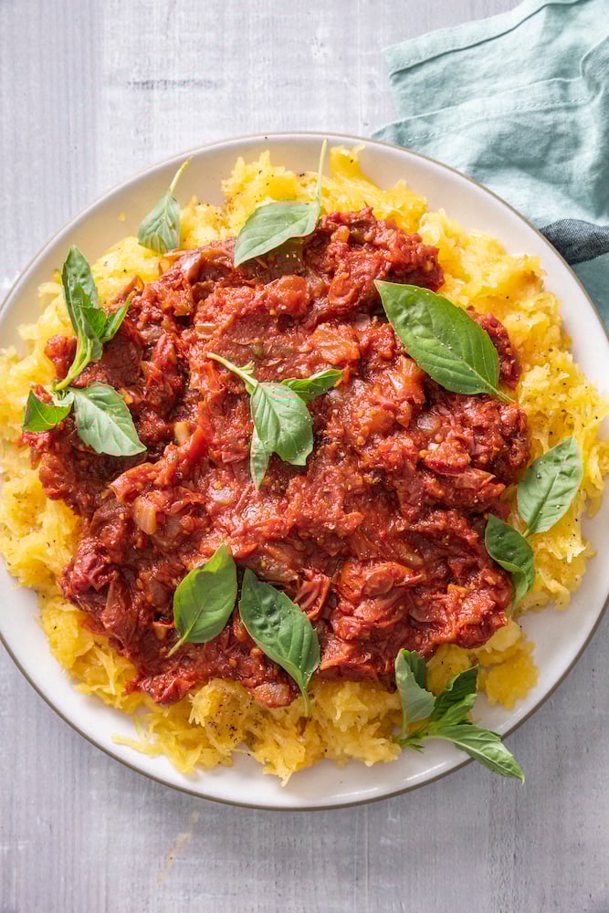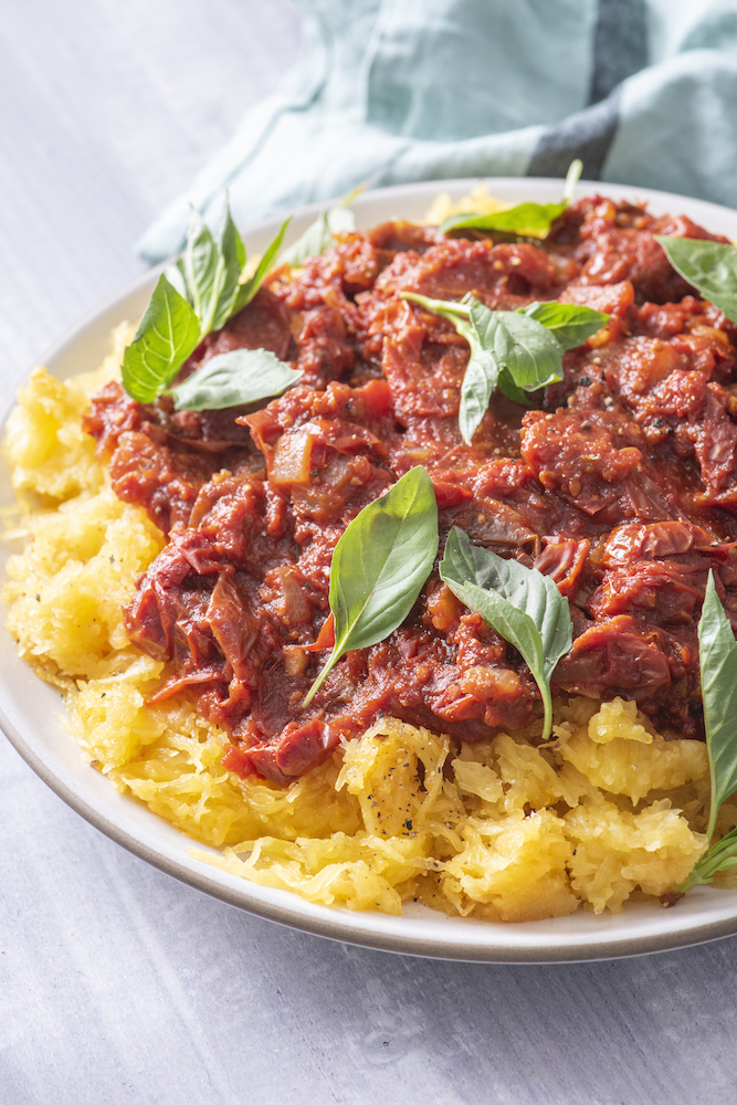 Spaghetti Squash Marinara is the best gluten free, low carb spaghetti alternative! My kids love this recipe and have never complained that it isn’t “real” pasta. It’s just THAT delicious.