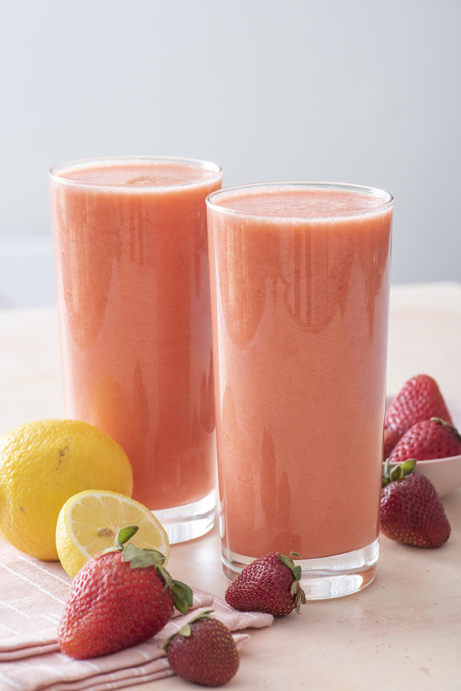 As soon as the produce is unpacked, Gemma is up at the counter rolling the lemons (one of her favorite kitchen jobs because she knows that’s the best way to release the juice). With just a rinse of the berries, a touch of natural sweetener, a quick puree and a brisk stir, our healthy lemonade is ready for us to gulp down and enjoy!