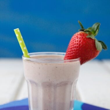 You can certainly use a nut butter in this recipe such as almond, peanut, soy or cashew, but there’s something we love about using sunflower butter (which also makes this smoothie a great nut-free option for those with allergies). I find that sunflower butter tastes just like peanut butter, but with a slightly earthier taste to it. When mixed with fresh strawberries and milk this drink is a major treat which tastes more like a decadent milkshake than a healthy smoothie!