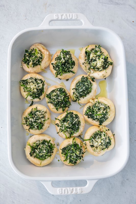 - Spoon filling evenly into mushroom caps, lightly brush each mushroom cap with olive oil and place them on a baking sheet.