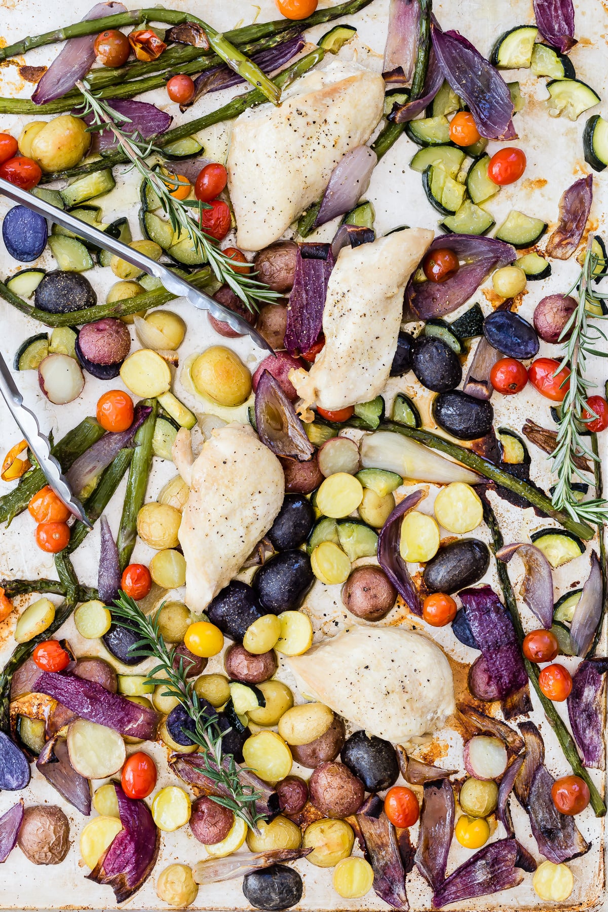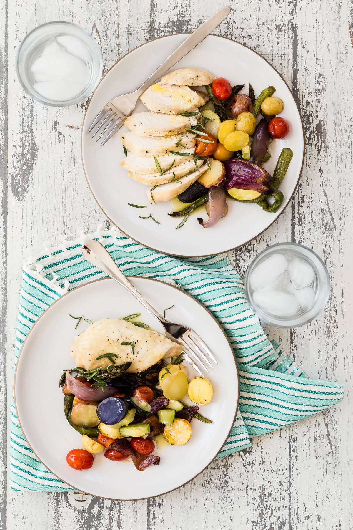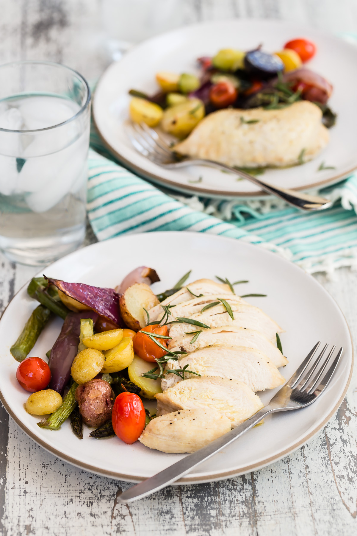 - In the same bowl you used for the vegetables add the chicken breasts and toss with olive oil and the remaining seasonings. Add to the sheet pan with the vegetables and roast for 30 minutes, or until the chicken is cooked through.