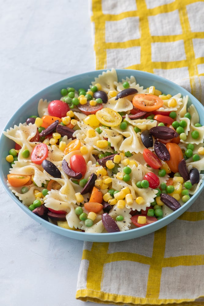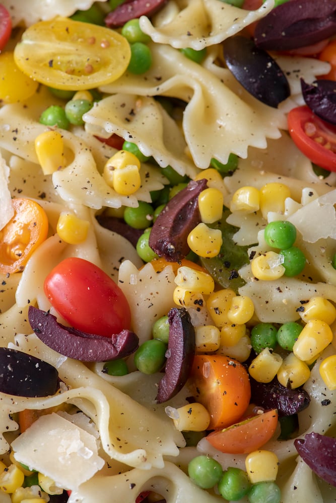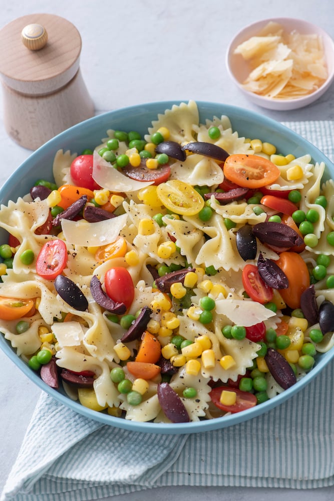 - In a large bowl, combine the cooked pasta, cherry tomatoes, corn, peas, olives and parmesan cheese.