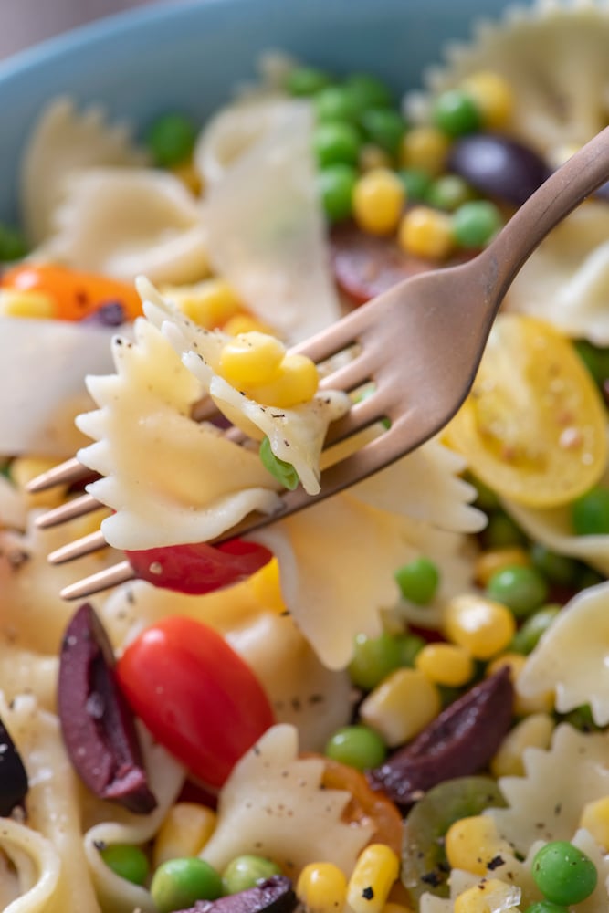 Then as I was cleaning out my freezer (which seems to be something I’m always doing??), I realized that I had a bunch of half-used bags of frozen vegetables like corn and peas sitting neglected in the freezer. This quick Summer Succotash Pasta Salad recipe was my solution to having to get rid of a bunch of food before we headed out of town for a couple of weeks.