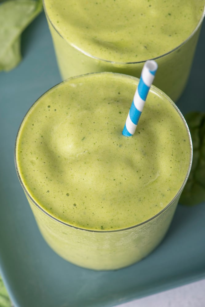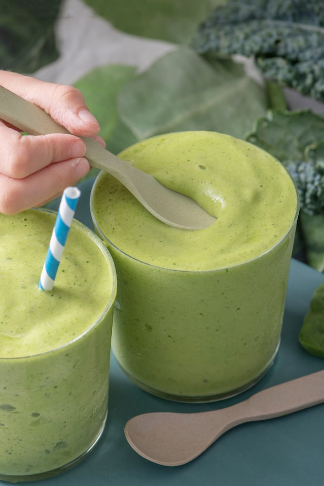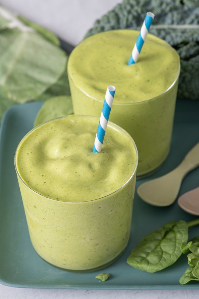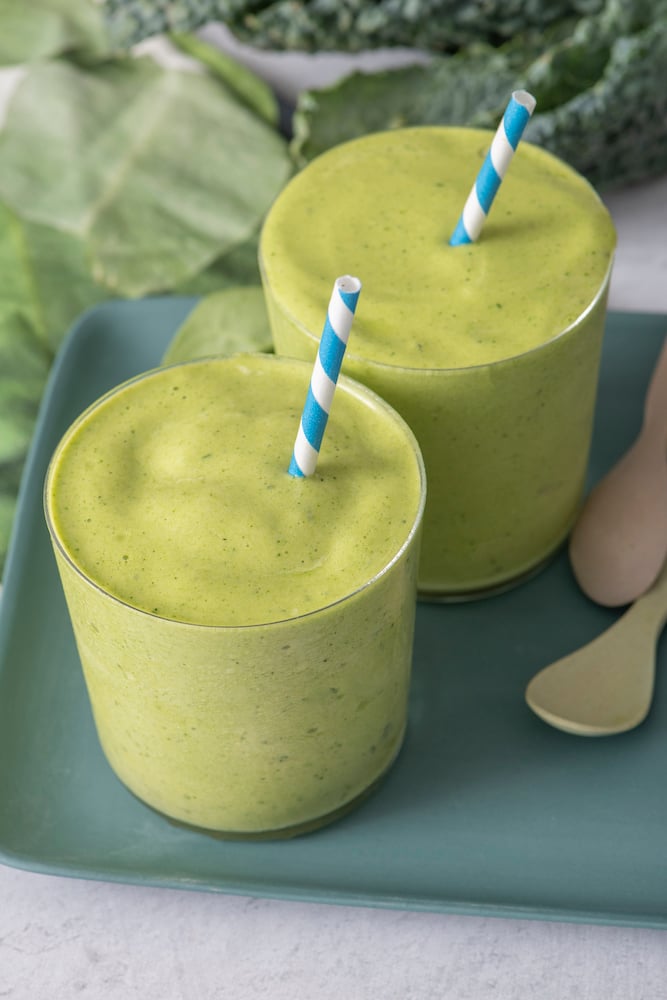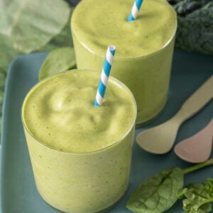 This Super Green Tropical Smoothie has been one of my go-to’s lately. It’s only a few ingredients and packed with nutrient dense kale and spinach. But it doesn’t taste “green” thanks to the natural sweetness from the banana, mango and pineapple. Gemma loves this smoothie. The texture is pretty thick on this one so she likes to eat it with a spoon like it’s ice cream. If you wanted it to be less thick, you can of course add more milk of your choice until it’s perfect for you.